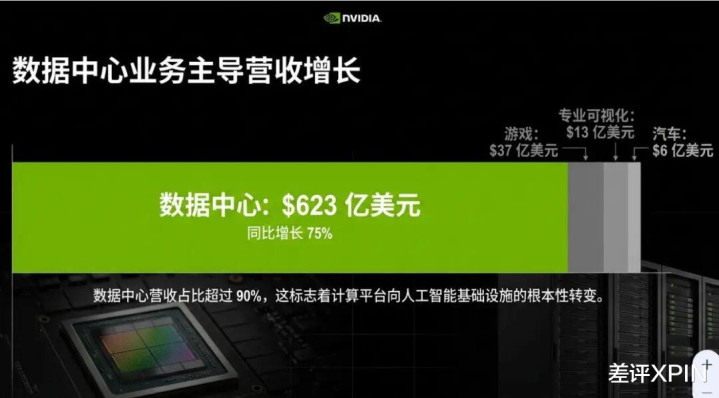 从细分业务来看,数据中心依旧是英伟达的绝对主力,当季度营收超过了623亿美元创单季收入新高,占到了总营收的9成以上。