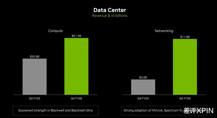 他们将数据中心收入,分成了数据中心计算和数据中心网络,前者收入513.34亿美元,同比增长58%,增速略高于三季度的56%;而后者尽管只占一小部分收入109.80亿美元,但同比增长却达到了263%,增速远超三季度的162%。