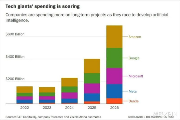 而在新的一年,这些巨头们继续加码,预计共投入超过6600亿美元,是美国政府在军费投入上的四分之三,超过了韩国政府全年总预算开支,相当于是一年里花掉了整个登月计划13年下来的钱(经过通胀换算后)。。。